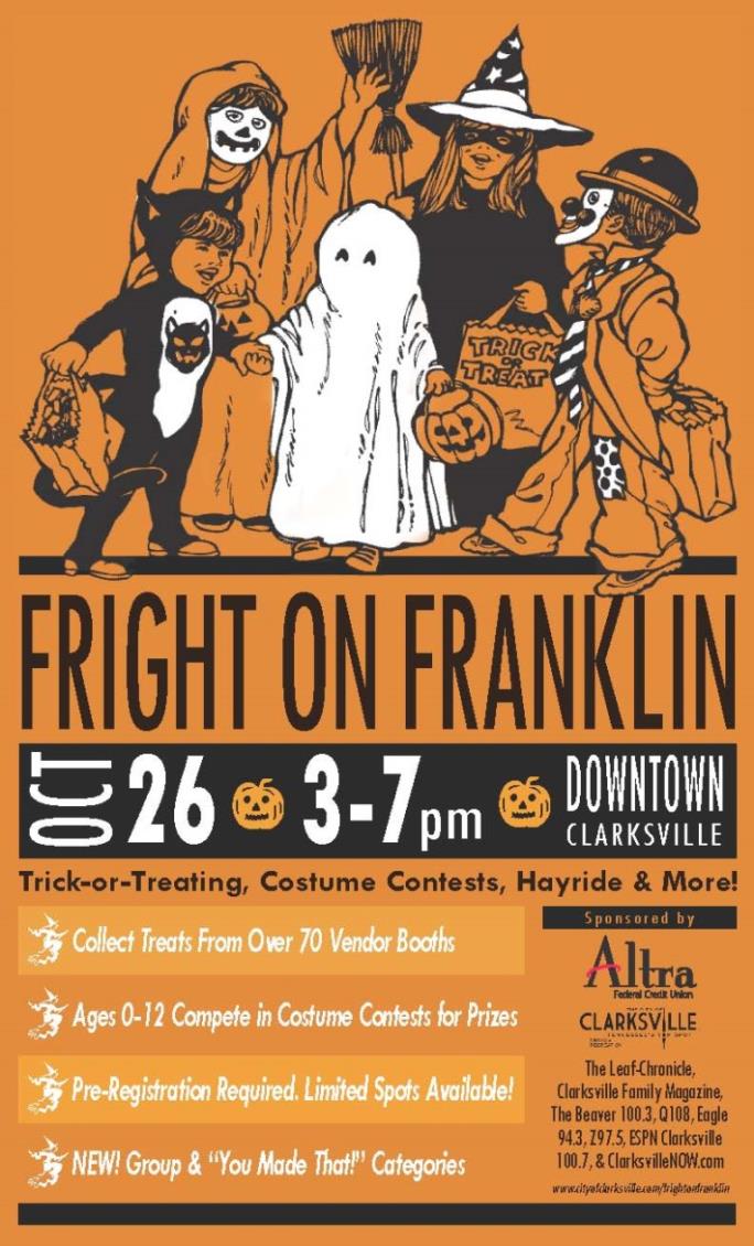 Enjoy a night of frightful fun at the 5th Annual Fright on Franklin in Downtown Clarksville on Saturday, October 26th from 3-7PM.   This festive Halloween event for adults and children of all ages will include safe trick-or-treating, costume contests, a Halloween Hayride and more.  For the Pinterest-savy parents, be sure to enter your child in the new “You Made That?” category, where homemade costumes will go head to head for prizes!  Pre-registration for all costume contests will be required, so make sure to visit the Parks and Recreation website to sign up early.