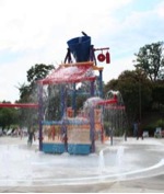 Pirate's Cove has a large pirate themed climbing play structure with giant buckets of water that dump, slides for tots and young children, water spraying everywhere.